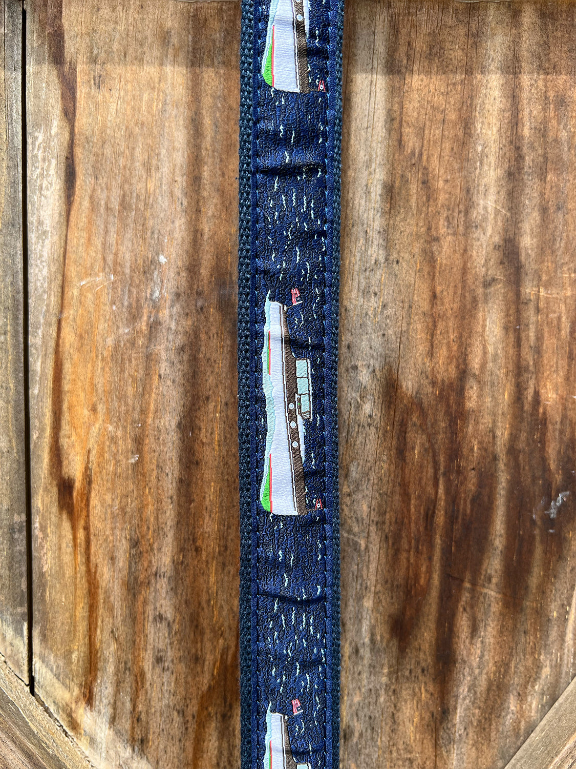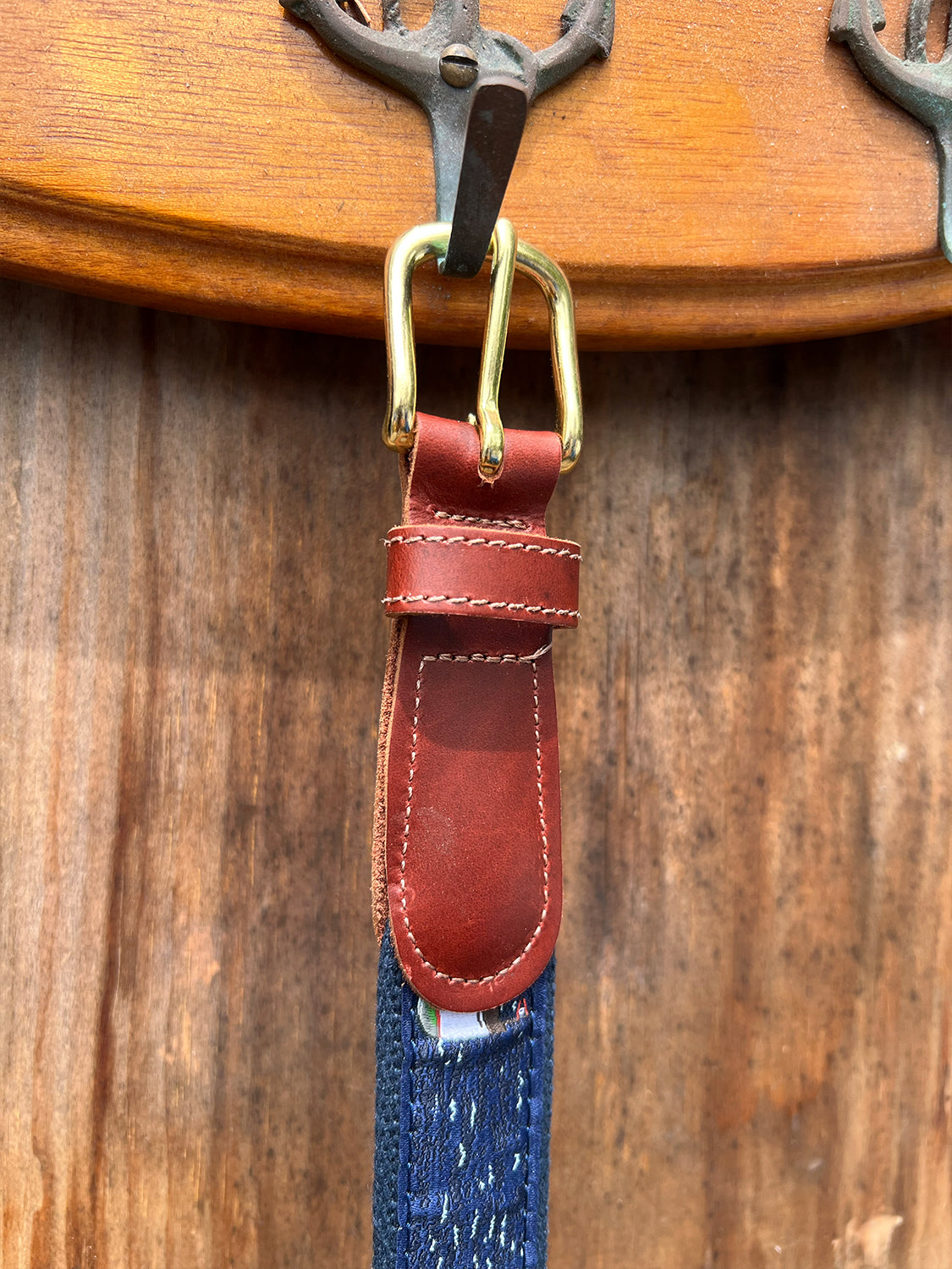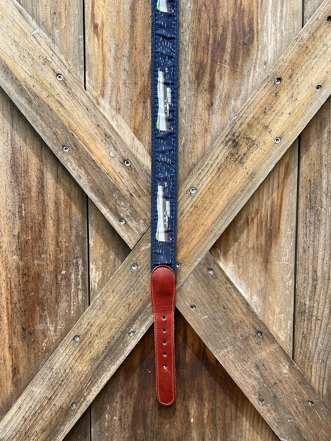 Classic nautical-style webbed belt with custom embroidery of a 1930s cabin cruiser flying the official OLD SOLDIER burgee