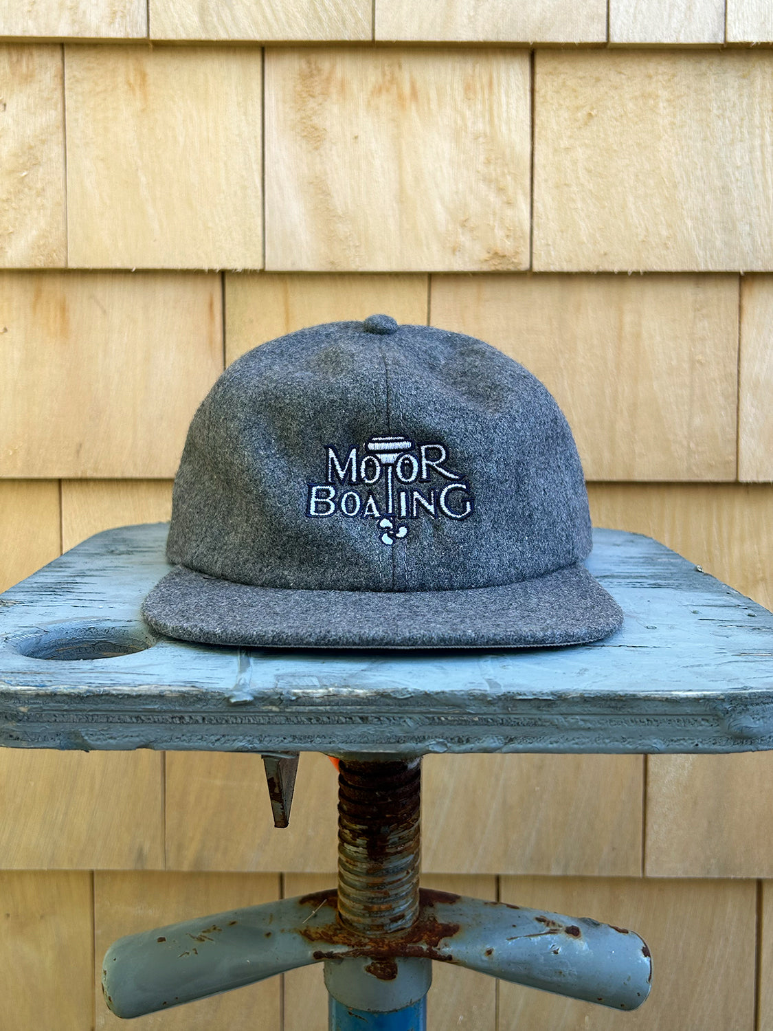 Premium wool cap with buckle closure featuring a rare 1920s-era MotorBoating emblem embroidery.