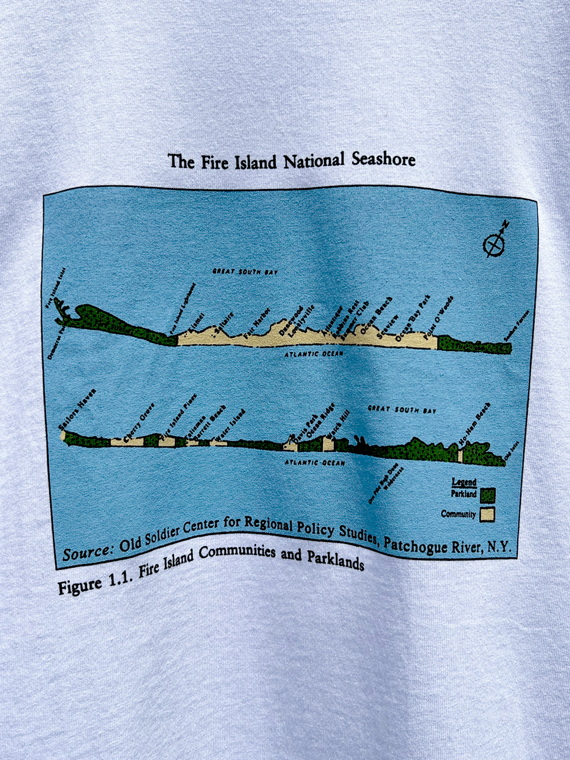 Standard fit tee featuring a map of the beaches and parklands of Fire Island, New York. The map begins west at Fire Island Inlet and ends east at the site of Old Inlet.